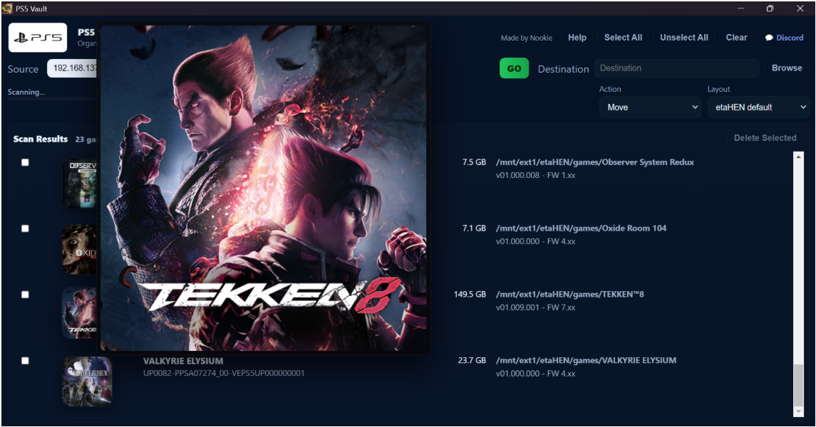 PS5 Vault permet de scanner automatiquement des dossiers contenant des jeux PS5 (via le fichier param.json) afin d’en extraire toutes les informations essentielles : nom du jeu, Content ID, version, taille et jaquette. Le scan peut se faire depuis un disque local (PC), ou directement sur la PS5 via FTP, sans téléchargement préalable, le tout avec un système de détection automatique, suppression des doublons et suivi de progression en temps réel.